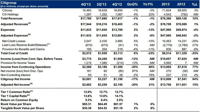 Výsledky banky Citigroup nenaplnily očekávání trhu a před zahájením obchodování banka na burze ztrácela kolem 3 %. Zisk na akcii byl ve čtvrtém kvartále jen 82 centů, čekalo se 95 centů, a tržby zůstaly těsně pod hranicí 18 miliard dolarů (17,94 miliardy), přestože analytici predikovali 18,18 miliardy dolarů.