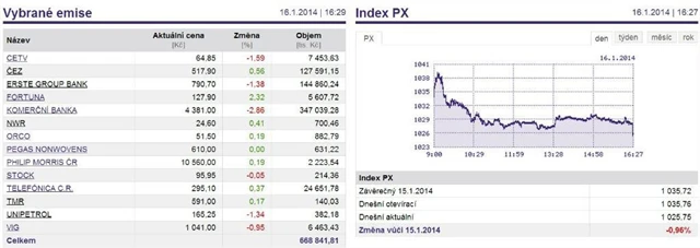 Telefónica C.R. zpevnila o 0,37 % poté, co Evropská komise schválila prodej společnosti PPF, která ke zprávě doplnila, že plánuje dovršit převzetí českého operátora do konce ledna. Přes dvě procenta připsala i Fortuna, která oznámila, že díky Olympijským hrám a mistrovství světa ve fotbale v Brazílii očekává v roce 2014 vyšší zisk.