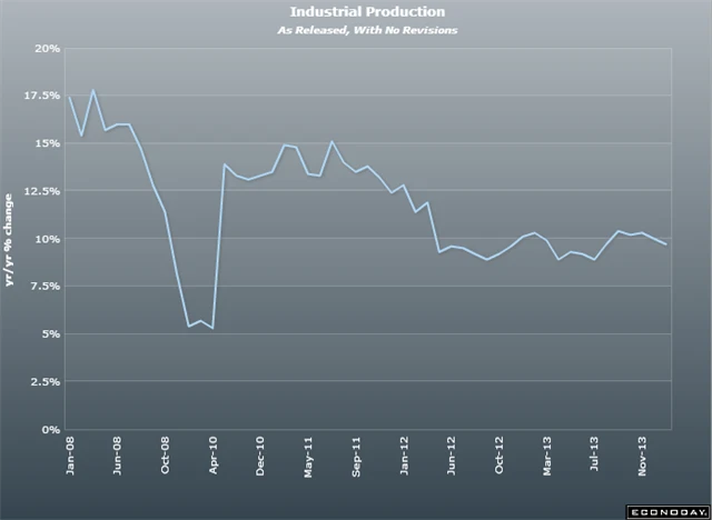 Za celý rok 2013 čínský HDP vzrostl o 7,7 %. Mezikvartální růst ve čtvrtém čtvrtletí o 1,8 % mírně zaostal za odhadovanými 2 %. Ve třetím čtvrtletí ekonomika Číny posílila meziročně o 7,8 %.