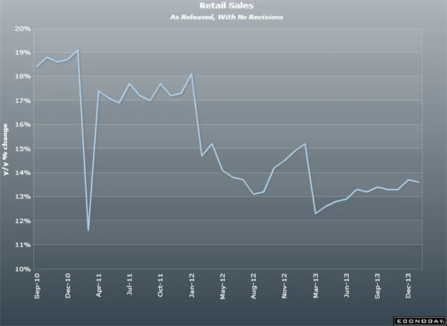 Maloobchodní tržby v prosinci meziročně narostly o 13,6 %, což byl i medián odhadů. Za celý rok se zvýšily o 13,1 %.