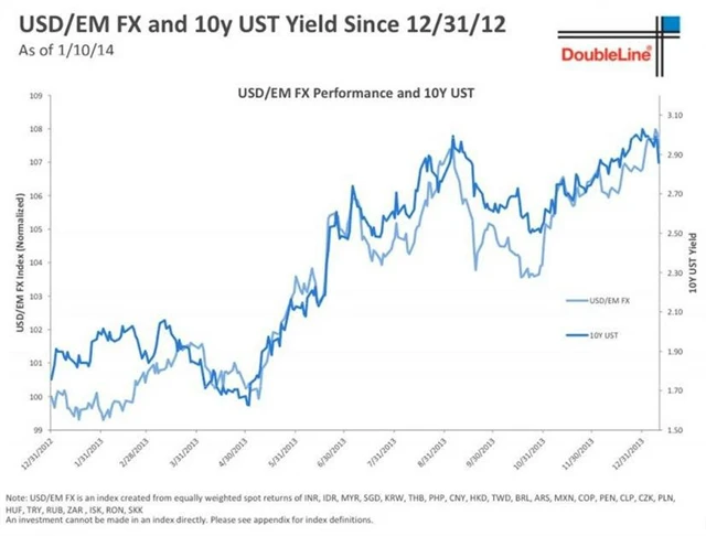 Gundlach tvrdí, že brzký pokles výnosů amerických vládních dluhopisů implikuje pokles kurzu dolaru vůči koši měn emerging markets. Právě trend výnosů desetiletých amerických vládních dluhopisů a trend kurzu dolaru vůči měnám emerging markets spolu totiž podle šéfa společnosti DoubleLine Funds tradičně korelují, přičemž kurz USD/EM FX funguje jako předstihový indikátor vývoje výnosů amerických 10letých bondů.