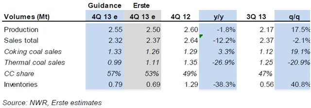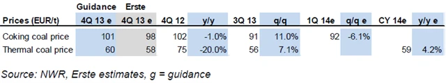 Oproti takzvané guidance samotné firmy čeká Erste za 4Q2013 menší podíl koksovatelného uhlí na celkové produkci. Mírně pesimističtější je i ohledně zrealizovaných cen. Pro první kvartál navíc čeká jejich další mírný pokles.