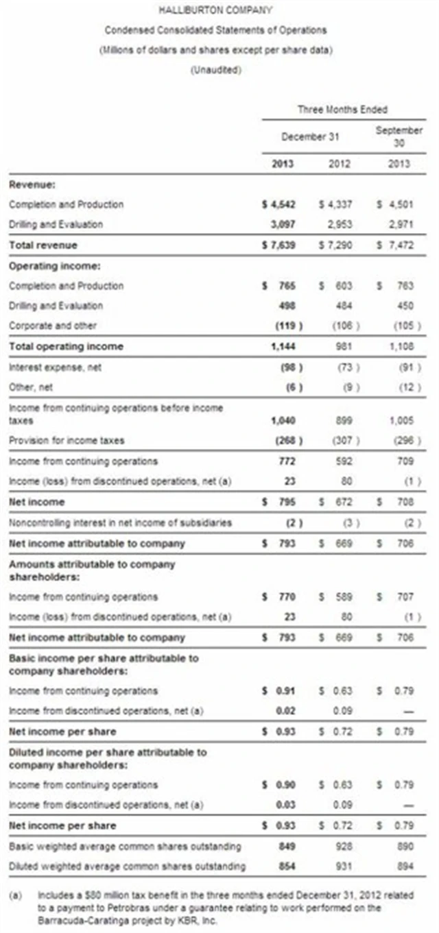 Výsledky Halliburton ve 4Q2013: Zisk na akcii 0,93 USD (odhad: 0,885 USD), tržby 7,639 miliardy USD (odhad: 7,557 miliardy USD) Redakce IW21. 1. 2014 | 13:11Výsledková sezónaZdroj: BloombergAktualita pro rok 2026Výsledková sezónaRedakce IW Další články autoraTOP 10 článků týdne: IPO SpaceX, akciová nejistota a OpenAi pálící miliardyTOP 10 článků týdne: Zapomínání, kontrariánské pohledy a smutný příběh RSBCOčekávané výsledky světových firem v týdnu od 15. prosince: Micron Technology, Nike, Carnival DoporučujemeZapomeňte na AI hyperscalery. Tohle mohou být podle Goldman Sachs vítězové roku 2026Výhled na rok 2026 NVIDIA má problém s hotovostí. Neví, kam s níZapomeňte na medvědy. Cena bitcoinu podle JPMorgan může vystřelit o skoro 90 %Bitcoin Aktualitydnes | 18:00Evropské akciové indexy za sebou mají vydařený pátek i celý týdendnes | 17:00Akcie Oracle posilují o 7 % po zapojení firmy do konsorcia pro provoz TikToku v USAdnes | 16:45Pražské burze se v pátek dařilo, index PX znovu posunul maximum. Ziskový byl pro trh i celý týdendnes | 16:22USA: Spotřebitelská důvěra podle Michiganské univerzity byla v prosinci revidována nížednes | 16:16USA: Prodeje starších rezidenčních nemovitostí v listopadu vzrostly o 0,5 %dnes | 15:59OpenAI údajně jedná o navýšení kapitálu až o 100 miliard dolarůdnes | 15:40Americké akcie v úvodu: Dow +0,45 %, S&P 500 +0,49 %, Nasdaq 100 +0,63 %dnes | 14:51Hackeři z KLDR letos ukradli kryptoměny za rekordní dvě miliardy dolarůdnes | 14:29Šéf newyorského Fedu Williams: Listopadová inflace byla zkreslená technickými faktorydnes | 14:14Majitel Temu PDD Holdings jmenoval jednoho ze svých CEO spolupředsedou představenstvadnes | 13:49Goldman Sachs věří v Santa rally, investoři dál sází na posílení akciídnes | 13:31Futures na americké akcie: Dow +0,02 %, S&P 500 +0,18 %, Nasdaq 100 +0,31 %Zobrazit všechny aktuality