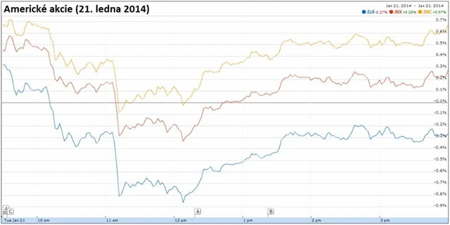 Po závěru řádného obchodování zveřejnily čtvrtletní výsledky svého hospodaření společnosti IBM a Texas Instruments. Počítačový obr IBM (v řádném obchodování -0,87 %) vykázal za poslední čtvrtletí minulého roku zisk 6,2 miliardy USD neboli 5,73 USD na akcii (loni: 5,13 USD na akcii) při tržbách 27,7 miliardy USD (odhad: 28,27 miliardy USD, loni: 29,3 miliardy USD). Tržby společnosti klesly již sedmým čtvrtletím v řadě a za odhady analytiků zaostaly již počtvrté v řadě. Tržby systémové a technologické divize, která zahrnuje servery a úložiště, klesly o 26,1 % na 4,26 miliardy USD a tržby globální divize technologických služeb, která je největší divizí firmy, se snížily o 3,6 % na 9,92 miliardy. Jediným světlým bodem byla softwarová divize, jejíž tržby se zvýšily o 2,8 % na 8,14 miliardy USD. Společnost dále uvedla, že za celý fiskální rok 2014 očekává zisk na akcii minimálně 17 USD a provozní zisk minimálně 18 USD. Trh očekává zisk 18,02 USD na akcii. Akcie IBM na výsledky v after-marketu reagovaly nejdříve posilováním o více než procento, poté však přešly do více než dvouprocentní ztráty.