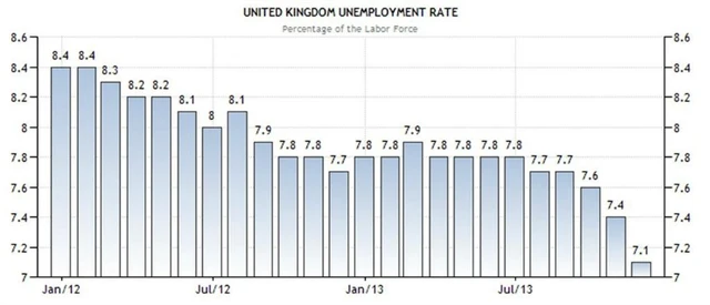 Míra nezaměstnanosti ve Spojeném království nečekaně klesla na nejnižší hladinu za více než pět let a ocitla se velmi blízko cílové hranici 7 % stanovené centrální bankou. Ve třech měsících do listopadu podíl lidí bez práce klesl na 7,1 % oproti 7,4 %, kterých dosáhl během čtvrtletí končícím v říjnu. Počet žádostí o podporu v nezaměstnanosti však přesto klesl méně, než se očekávalo. Výsledky by mohly znamenat vyšší tlak na šéfa britské centrální banky Marka Carneyho, aby poupravil rétoriku banky, která prozatím vázala svou politiku na 7% cílovou hranici míry nezaměstnanosti. V zápisu z jednání Bank of England však vyplývá, že bankéři s tímto vývojem počítali, protože se usnesli na tom, že není třeba překotně zvyšovat sazby, i když bude dosaženo 7% míry nezaměstnanosti.