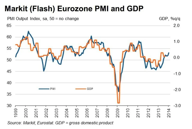 Souhrnný index nákupních manažerů (PMI), který zahrnuje data za zpracovatelský průmysl i sektor služeb, podle prvních údajů v lednu stoupl na 53,2 bodu z 52,1 bodu v předešlém měsíci. Index měří podnikatelskou aktivitu v tisícovkách firem a je vnímán jako solidní ukazatel zdraví ekonomiky. Klíčová je pro něj hranice 50 bodů, která odděluje růst od poklesu.