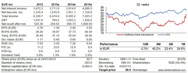 Hohberger nevidí důvod, aby se akcie Raiffeisen obchodovaly 33 % pod svými konkurenty, zároveň však přiznává, že ziskovost (7,3 % ROE14e) stále za konkurencí zaostává (pro banky v CEE je to 10,6 %). Proto také vidí jako reálný cíl, že akcie se dostanou na svou účetní hodnotu a zvyšuje cílovou cenu na 38 EUR.