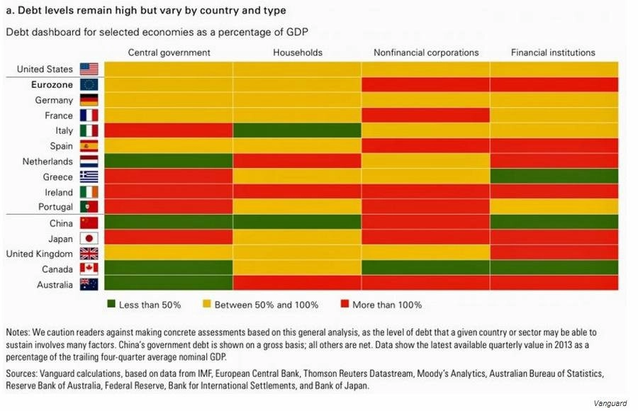 Společnost Vanguard ve svém výhledu na rok 2014 zveřejnila mapu zadlužení světových zemí. Podívejte se, kdo patří podle poměru dluhu k HDP do rizikové skupiny, a kdo dluhy ještě zvládá. Nejde přitom jen o dluhy státu, ale i dluhy domácností, firem a finančních institucí.