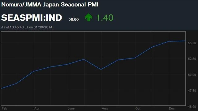 V zemi vycházejícího slunce zatím kvantitativní uvolňování celkem funguje. Meziročně vzrostly ceny v prosinci o 1,3 %, analytici čekali jen 1,2 %. Bez potravin a energií byla inflace +0,7 %. Za celý uplynulý rok stoupl index spotřebitelských cen o 0,4 %, což je první zvýšení po pěti letech, napsala agentura AP. Průmyslová výroba ve stejném měsíci meziměsíčně vzrostla o 1,1 % (odhad: 1,2 %), meziročně podle očekávání narostla o 7,7 %. Míra nezaměstnanosti v prosinci klesla na 3,7 %, což je nejnižší úroveň za šest let.