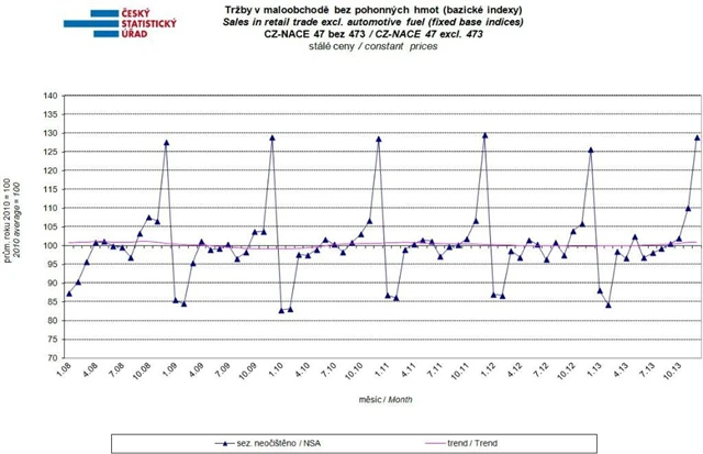 Tržby v maloobchodě včetně motoristického segmentu po očištění o sezónní vlivy klesly v prosinci reálně meziměsíčně o 1,2 % a meziročně očištěné o vliv počtu pracovních dní vzrostly o 3,6 %. Meziroční růst tržeb bez očištění o 5,2 % byl ovlivněn zejména vývojem motoristického segmentu a nepotravinářského zboží. Za celý rok 2013 se tržby v maloobchodě včetně motoristického segmentu zvýšily reálně meziročně o 1,0 %.