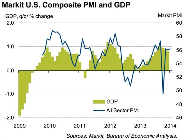 Aktivita v americkém sektoru služeb vzrostla více, než se čekalo. Index nákupních manažerů vyskočil na 56,7 bodu z prosincových 55,7 bodu a již třetí měsíc v řadě se tak nachází nad padesátibodovou hranicí dělící expanzi od kontrakce. Produkce odvětví navíc narostla nejprudším tempem od září 2013. Kompozitní index vzrostl jen mírně na 56,2 bodu z 56,1 bodu v prosinci a zaznamenal tak rovněž třetí měsíc v řadě nad padesáti body.