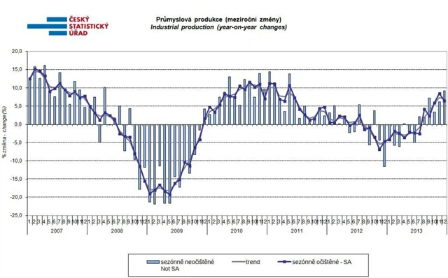 Průmyslová produkce v prosinci meziročně vzrostla reálně o 9,3 %, po očištění od vlivu počtu pracovních dnů vzrostla o 6,7 %. Ve srovnání s předchozím měsícem byla po vyloučení sezónních vlivů nižší o 0,3 %. Hodnota nových zakázek meziročně vzrostla o 20,5 %. V roce 2013 průmyslová produkce vzrostla meziročně o 0,5 %. Hodnota nových zakázek byla vyšší o 4,3 %.