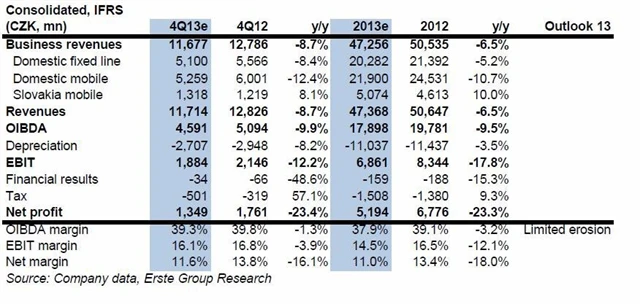 Telefónica C.R. zveřejní výsledky za 4Q2013 26. února, nejsledovanější bude dle analytičky z Erste dividenda. Sutedja nepředpokládá, že by PPF chtěla nějakou vyplatit.