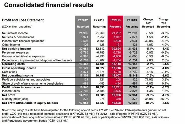 Výsledky byly v souladu s odhady. Analytici pokles zisku o zhruba 9 až 12 % na 12,5 miliardy Kč očekávali. V roce 2012 vykázala KB zisk 13,95 miliardy Kč.