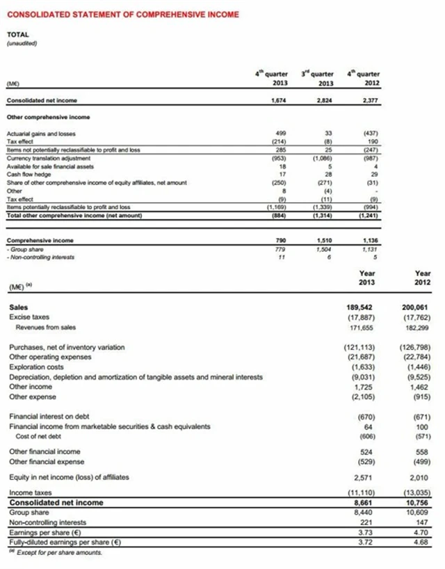 Výsledky Total ve FY2013: Zisk na akcii 4,749 EUR (odhad: 4,830 EUR), tržby 182,542 miliardy EUR (odhad: 174,830 miliardy EUR)