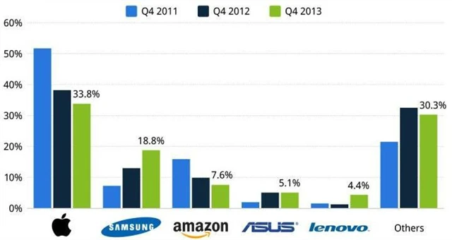 Zatím Samsungu jeho taktika vychází. Takto vypadá trh s tablety - Apple sice stále vede, ale podíl Samsungu roste mnohem rychleji.