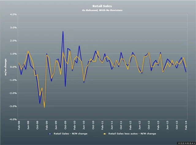 Maloobchodní tržby ve Spojených státech v lednu klesly o 0,4 %, analytici přitom očekávali jejich stagnaci. Prosincová data byla revidována na 0,1% pokles z předchozího 0,2% růstu. Bez zahrnutí dopravních prostředků tržby zůstaly beze změny, čekal se 0,1% růst (prosinec: revize na +0,3 % z +0,7 %).