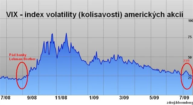 Aktuální úrovně naznačují jednu důležitou věc. Indikují na možný budoucí pokles akciového trhu. Důvodem je mimo jiné historická paralela, kdy hodnota 25 problikávala na indexu VIX těsně před pádem banky Lehman Brothers na podzim minulého roku. Ale s jednou podstatnou výjimkou, americké akcie byly tenkrát o třetinu výše než nyní.