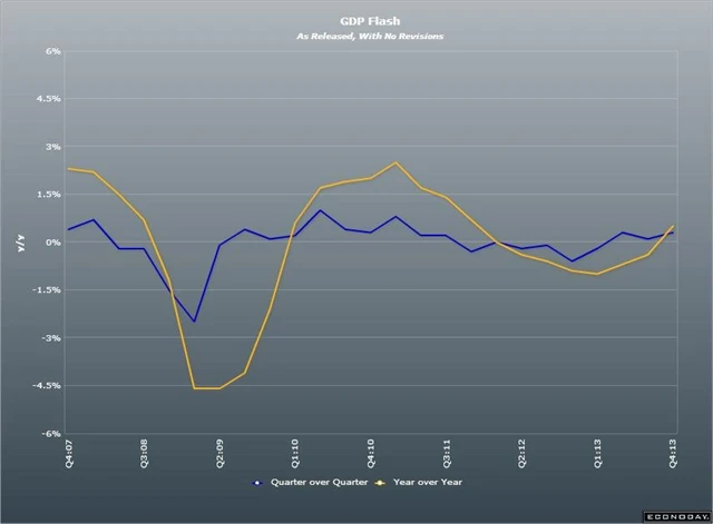 Hrubý domácí produkt eurozóny v posledním čtvrtletí minulého roku podle předběžných údajů vzrostl o 0,5 % meziročně, tedy o 0,1 procentního bodu více, než se očekávalo (3Q2013: -0,3 %). Mezičtvrtletní růst dosáhl 0,3 % (odhad: +0,2 %). Za celý rok ale eurozóna vykázala pokles o 0,4 %.