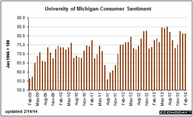 Spotřebitelská důvěra ve Spojených státech v únoru zůstala beze změny navzdory rostoucímu optimismu Američanů ohledně budoucího vývoje ekonomiky. Vyplývá to z předběžných výsledků průzkumu agentury Reuters a Michiganské univerzity, podle kterých index spotřebitelské důvěry stagnoval na 81,2 bodu. Čekal se pokles na 80,6 bodu.