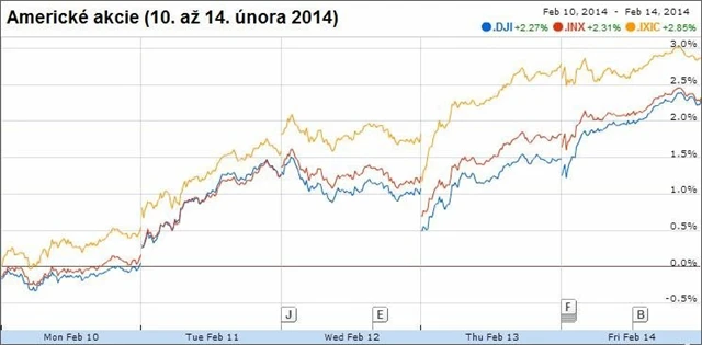 Za celý týden Dow zesílil o 2 %, S&P o 2,1 % a Nasdaq o 2,7 %. Pro všechny tři burzovní indexy jde o druhý ziskový týden v řadě a nejlepší týden roku 2014. Nasdaq jej zakončil na 13,5letém maximu.