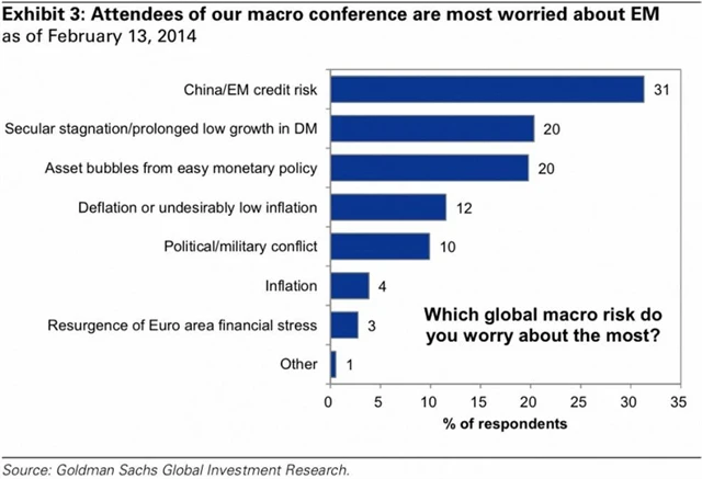 V minulém týdnu se zástupci Goldman Sachs sešli s 2 tisíci klientů v Hongkongu a Tokiu. Z průzkumu, který udělali, vyplývá, že 31 % z nich se nejvíce obává úvěrového rizika Číny a emerging markets, 20 % znepokojuje možnost vzniku bubliny na trhu způsobené uvolněnou monetární politikou, stejné procento se obává stagnace nebo dlouhého utlumeného růstu.