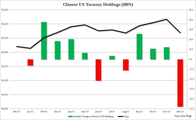 Čína se v prosinci zbavila amerických vládních a firemních dluhopisů v objemu 48 miliard dolarů, což znamená největší výprodej za poslední dva roky. Celkový objem amerických dluhopisů v držení Číny tak na konci minulého roku klesl na 1,2689 bilionu USD, kde se naposledy pohyboval v březnu 2013.