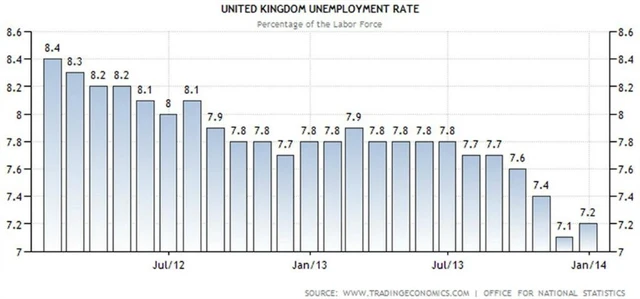 Míra nezaměstnanosti ve Spojeném království v průběhu tří měsíců do prosince loňského roku mírně vzrostla na 7,2 % z předchozích 7,1 %, ačkoli se očekávala stagnace. V lednu klesl počet žádostí o podporu v nezaměstnanosti o 27 600, více než očekávaných 20 tisíc.