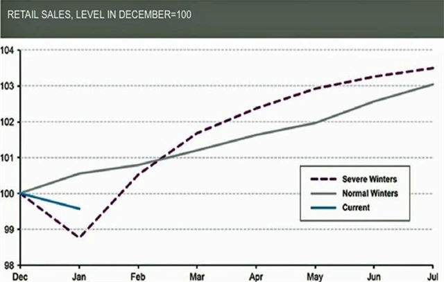 Horší data z americké ekonomiky v posledních týdnech mnozí analytici z velké části přičítají mimořádně nepříznivému počasí. Scott Minerd z Guggenheim Partners se podíval na historii "krutých zim" v USA a vývoj maloobchodních tržeb v dalších měsících. A maloobchodníci mohou zůstat v klidu - jejich tržby by po zimě měly začít růst rychleji, než by tomu bylo v případě, že by zima byla jen mírná. Jde samozřejmě jen o historické průměry, žádnou závaznou předpověď.