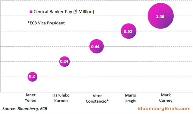 Je samozřejmě zavádějící srovnávat pouze výše platů jednotlivých bankéřů, aniž bychom porovnali náklady na bydlení v daných zemích a další faktory, i přesto se zdá, že Mark Carney vyhrál svým postem loterii.