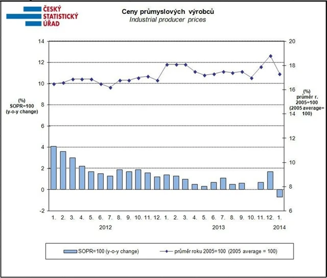 Ceny průmyslových výrobců meziměsíčně klesly o 1,3 %, což je první lednový pokles od vzniku ČR způsobený zejména snížením cen v oddílu elektřiny, plynu a páry o 8,7 %. Ceny elektřiny klesly o 11,3 %. V oddílu koksu a rafinovaných ropných produktů se ceny snížily o 1,4 %, těžby a dobývání o 0,9 % a dopravních prostředků o 0,4 %. Zvýšily se ceny vody, její úpravy a rozvodu o 3,4 %, chemických látek a výrobků o 1,3 % a potravinářských výrobků, nápojů a tabáku o 1,0 %.