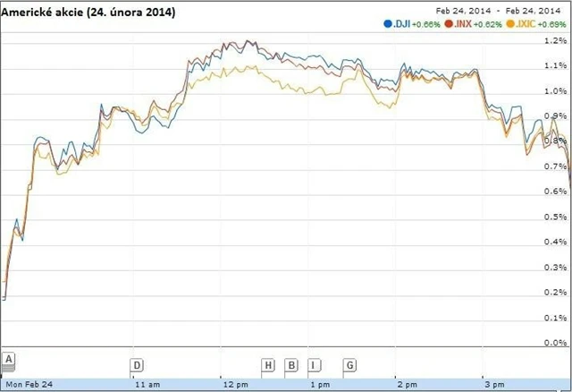 Wall Street podpořilo i víkendové svržení ukrajinského prezidenta Viktora Janukovyče. "Makroekonomická rizika střetu na Ukrajině se po odstranění prezidenta rozptýlila a obnovil se určitý klid," řekl agentuře Reuters Mark Luschini z filadelfské firmy Janney Montgomery Scott.