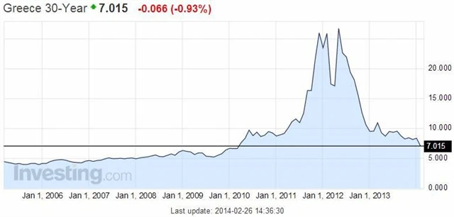 Výnos třicetiletých dluhopisů klesl pod 7 % poprvé od dubna 2010 v reakci na setkání šéfa řecké centrální banky Jorgose Provopulose se zástupci Evropské komise, Mezinárodního měnového fondu a Evropské centrální banky. Výnosy dluhopisů klesají také díky tomu, že se státní plynárenská společnost Depa dohodla s ruským Gazpromem na cenách zemního plynu.