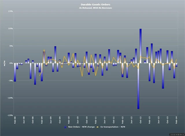 Objednávky zboží dlouhodobé spotřeby ve Spojených státech v lednu klesly o jedno procento, čekal se pokles o 1,7 %. Prosincový propad o 4,3 % byl revidován na -5,3 %. Po očištění o dopravní zakázky objednávek přibylo o 1,1 % (odhad: -0,2 %, prosinec revidován na -1,9 % z -1,6 %). Bez armádních zakázek a letadel se objednávky zlepšily dokonce o 1,8 % (odhad: -0,2 %).