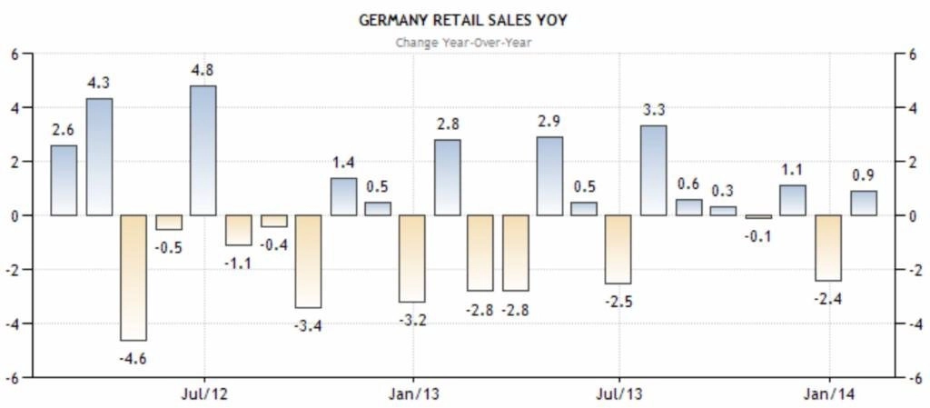 Meziročně v lednu tržby německých maloobchodníků vzrostly o 0,9 %, ačkoli se čekal pokles o 1,2 %. Data za prosinec byla revidována na -1,5 % z -2,4 %.