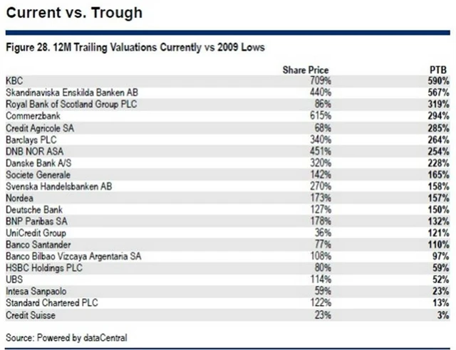 Zároveň se od roku 2009 stále zvyšuje ocenění bank. Následující tabulka ukazuje nárůst poměru ceny k hmotným aktivům. Je zjevné, že 15 z 21 sledovaných bank se již vrátilo na, a dokonce nad hodnoty z roku 2009.