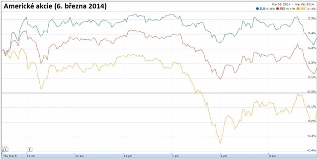 Americké akcie ve čtvrtek dopoledne obnovily vzestup a širší index S&P 500 posunul své historické intradenní maximum na 1 881,94 bodu. Trh podpořily dílčí údaje z trhu práce, podle kterých týdenní počet nových žádostí o podporu v nezaměstnanosti v USA minulý týden klesl na minimum za tři měsíce. Smíšené pocity ale investoři nadále mají z ne zcela jednoznačného vývoje situace na ukrajinském Krymu.