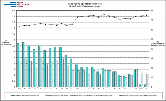 Spotřebitelské ceny vzrostly v únoru proti lednu o 0,2 %. Tento vývoj ovlivnilo zvýšení cen zejména v oddíle rekreace a kultura. Meziroční růst spotřebitelských cen zůstal v únoru stejný jako v lednu, tedy 0,2 %. Data zveřejnil v pondělí Český statistický úřad. Zprávu o míře nezaměstnanosti přineslo Ministerstvo práce a sociálních věcí. Podle ní podíl lidí bez práce stagnoval na lednové úrovni 8,6 %.