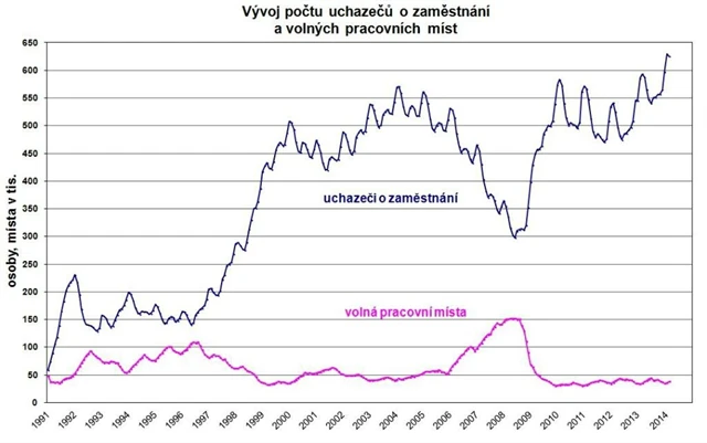 Podíl nezaměstnaných osob, tedy počet dosažitelných uchazečů o zaměstnání ve věku 15 až 64 let k obyvatelstvu stejného věku, zůstal k 28. únoru na hodnotě na 8,6 % (leden 2014 – 8,6 %, únor 2013 – 8,1 %). Podíl nezaměstnaných stejný nebo vyšší než republikový průměr vykázalo 41 okresů, nejvyšší byl v okresech Bruntál (15 %), Jeseník (14,5 %), Most (13,9 %), Ústí nad Labem (13,2 %), Karviná (13,0 %) a Znojmo (12,6 %). Nejnižší podíl nezaměstnaných byl zaznamenán v okresech Praha-východ (3,7 %), Praha-západ (4,6 %), Mladá Boleslav (4,9 %), Praha (5,4 %), Plzeň-jih (5,6 %) a Rokycany (5,8 %). Podíl nezaměstnaných žen zůstal na 8,2 % a podíl nezaměstnaných mužů na 9,0 %.
