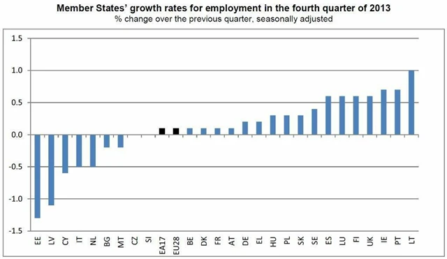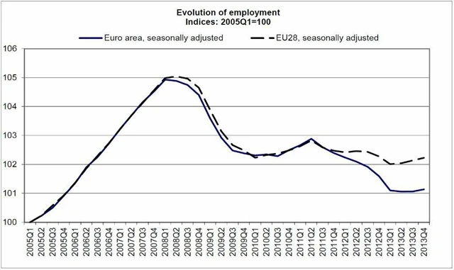 Eurozóna: Zaměstnanost ve 4Q2013 vzrostla mezičtvrtletně o 0,1 %, meziročně ale o 0,5 % klesla