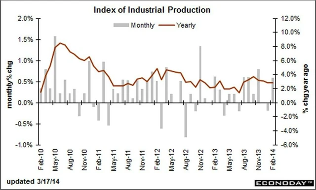 Průmyslová výroba ve Spojených státech v únoru vzrostla o 0,6 %, čekal se růst o 0,1 % po lednovém poklesu. Využití kapacit vzrostlo na 78,8 % ze 78,5 %, čekal se pouze mírnější nárůst na 78,6 %.