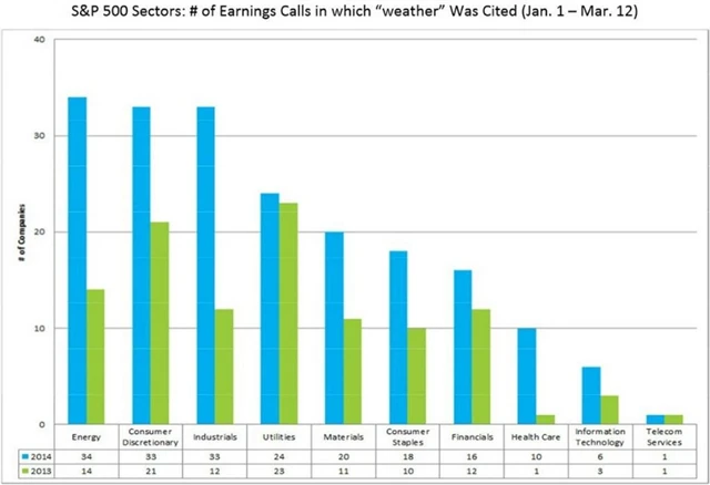 V grafu FactSet ukazuje, jak často společnosti z jednotlivých sektorů indexu S&P 500 v kontextu snižování predikce zisku zmiňovaly zimu. "Po prozkoumání přepisů všech konferenčních hovorů společností z S&P 500 mezi lednem 2014 a 12. březnem 2014 jsme zjistili, že minimálně jednou byl pojem počasí zmíněn ve 195 hovorech. To představuje nárůst o 81 % meziročně, kdy ve stejném období se o tomto faktoru mluvilo jen ve 108 konferenčních hovorech," upozorňuje Butters.