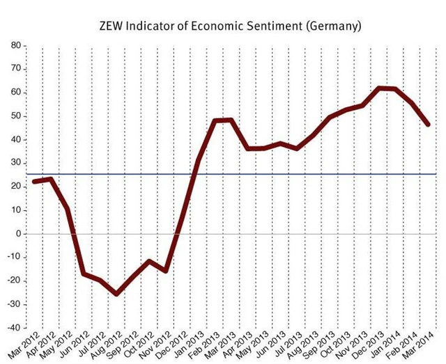 Důvěra investorů v německou ekonomiku v březnu klesla třetí měsíc v řadě kvůli napětí na Ukrajině. Indikátor očekávání analytiků a investorů ohledně následujících šesti měsíců podle institutu ZEW klesl na 46,6 bodu z 55,7 bodu v únoru. Očekával se mírnější pokles na 52 bodů. V prosinci byl přitom na sedmiletém maximu 62 bodů.