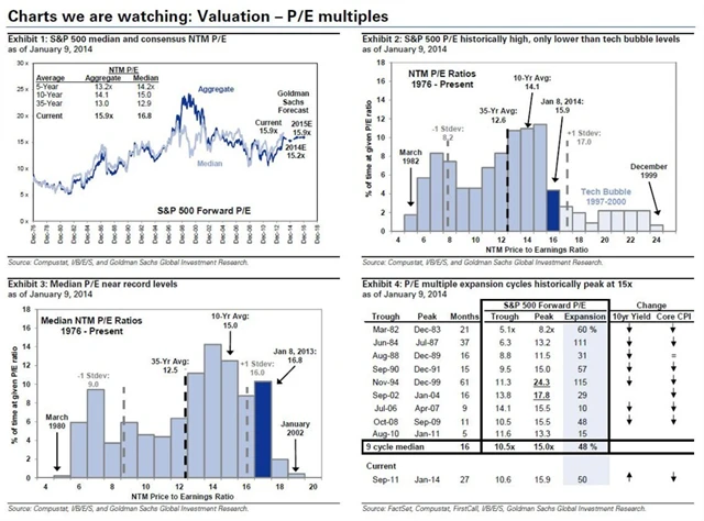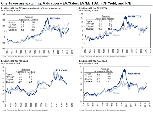 David Kostin, hlavní akciový stratég Goldman Sachs, považuje současné valuace S&P 500 za vysoké jak pro celkový trh, tak i mediánovou akcii, a to za použití kterékoli z obvyklých valuačních metod (P/E, cyklus expanze P/E, EV/tržby, EV/EBITDA, výnos z volného cash flow, P/B a vztah ROE a P/B v porovnání s úrovní inflace, nominálními 10letými výnosy amerických státních dluhopisů a reálnými úrokovými mírami).