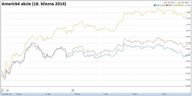 Americké akcie do úterní obchodní seance vstoupily mírně nad nulou a během první poloviny obchodování svižně rostly. Investory uklidnilo vyjádření ruského prezidenta Vladimira Putina, který řekl, že Rusko po připojení Krymu neobsadí další ukrajinské regiony. Investoři nyní čekají na výsledek dvoudenního zasedání měnového výboru americké centrální banky. To skončí zítra a mimo jiné se na něm rozhodne, zda Fed bude pokračovat v postupném utahování monetární politiky.