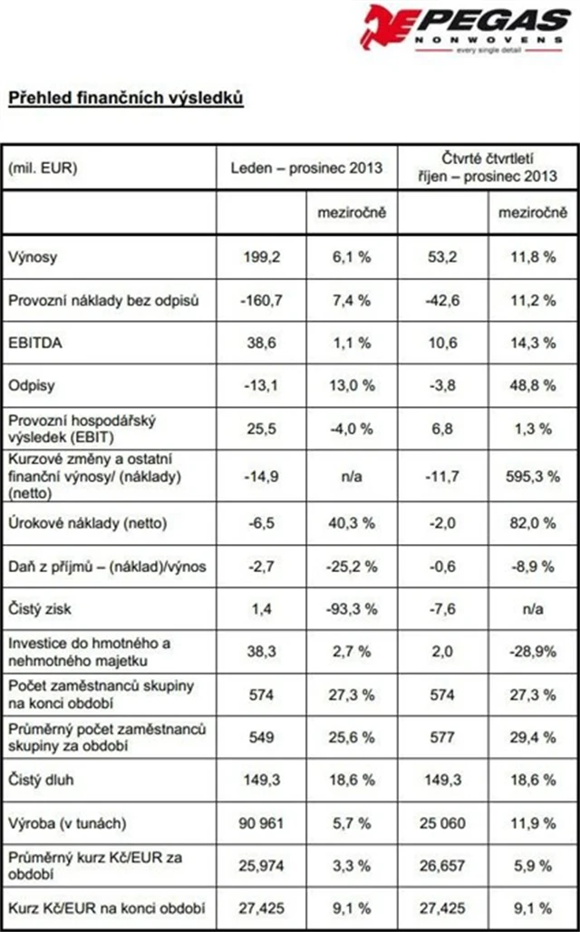 "Čistý výsledek není u Pegasu obvykle tak důležitý kvůli výraznému vlivu nepeněžního forexového přecenění. Firma zveřejnila silný zisk EBITDA za 4Q2013 i dobrý výhled (očekávali jsme ho opatrnější po problémech v loňském roce)," okomentoval výsledky Petr Bártek, analytik z České spořitelny.
