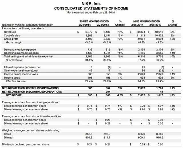 - Výsledky Nike v 3QFY2014: Zisk na akcii 0,76 USD (odhad: 0,72 USD), tržby 6,97 miliardy USD (odhad: 6,81 miliardy USD). Akcie v řádném obchodování +0,15 %, v after-marketu posilovaly o více než dvě procenta.