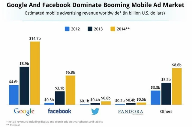 Facebook a Google se v posledních dvou letech dostaly z pozice velkých hráčů na trhu mobilní reklamy a ovládly ho úplně. Podle údajů společnosti eMarketer v roce 2013 dohromady tyto dvě firmy kontrolovaly 75,2 % trhu.