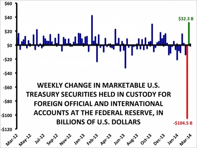 V týdnu do 12. března 2014 se objem aktiv v amerických vládních dluhopisech na účtech zahraničních institucí vedených u americké centrální banky propadl o 104,5 miliardy USD. Analytici si to vysvětlovali různě. Nyní ale řeší opačnou otázku. V týdnu do 19. března objem účtů nabobtnal o více než 32 miliard USD, ale nikdo neví proč.