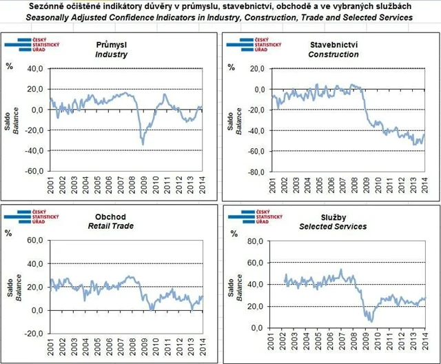 Celková důvěra v domácí ekonomiku se v březnu zvýšila. Souhrnný indikátor důvěry (indikátor ekonomického sentimentu) ve srovnání s únorem vzrostl o 1,4 bodu a to vlivem zvýšení podnikatelského i spotřebitelského indikátoru důvěry. Mezi podnikateli se důvěra mírně zvýšila v průmyslu, ve vybraných odvětvích služeb se zvýšila; v obchodě se důvěra nezměnila a ve stavebnictví snížila. Ve srovnání s hodnotami v březnu 2013 jsou souhrnný indikátor důvěry, indikátor důvěry podnikatelů a indikátor důvěry spotřebitelů vyšší.